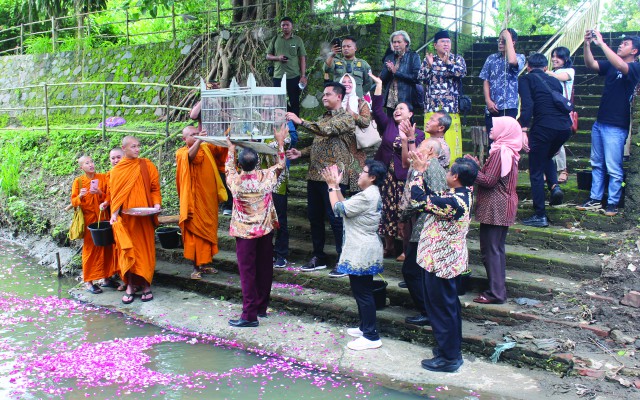 Setelah penuangan air ke tanah selesai, acara dilanjutkan dengan prosesi Fangshen, yakni pelepasan ikan dan burung oleh Bhikkhu/Bhiksuni, Bupati, dan Tokoh Agama/Kepercayaan sebagai simbol pembebasan kehidupan dan pemulihan keseimbangan alam. Prosesi Fangshen menempuh rute agak panjang dari komplek vihara menuju sungai. Setelah sampai di pinggir sungai, bunga mawar ditaburkan. Selanjutnya sejumlah ikan dilepaskan ke sungai dan burung diterbangkan ke udara.